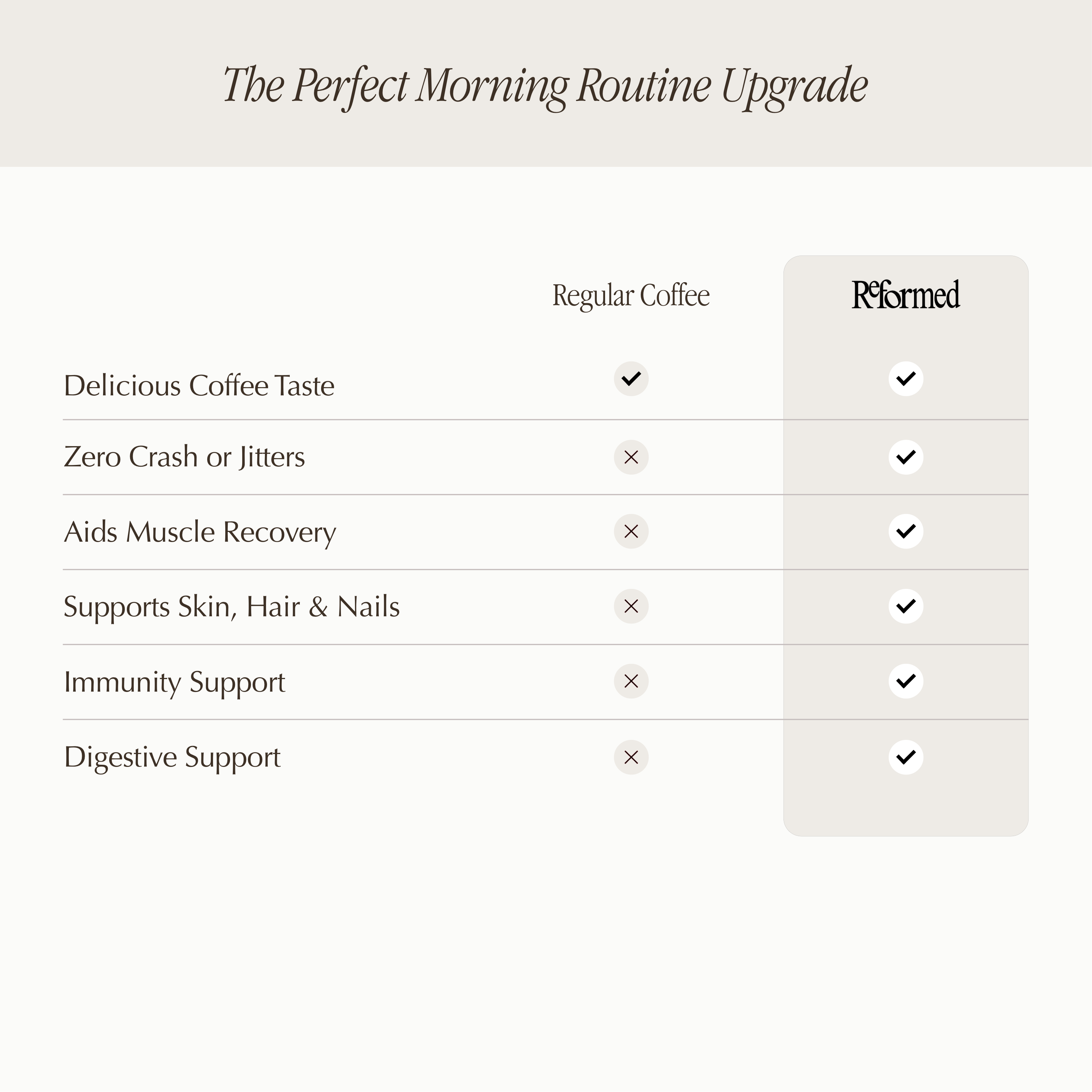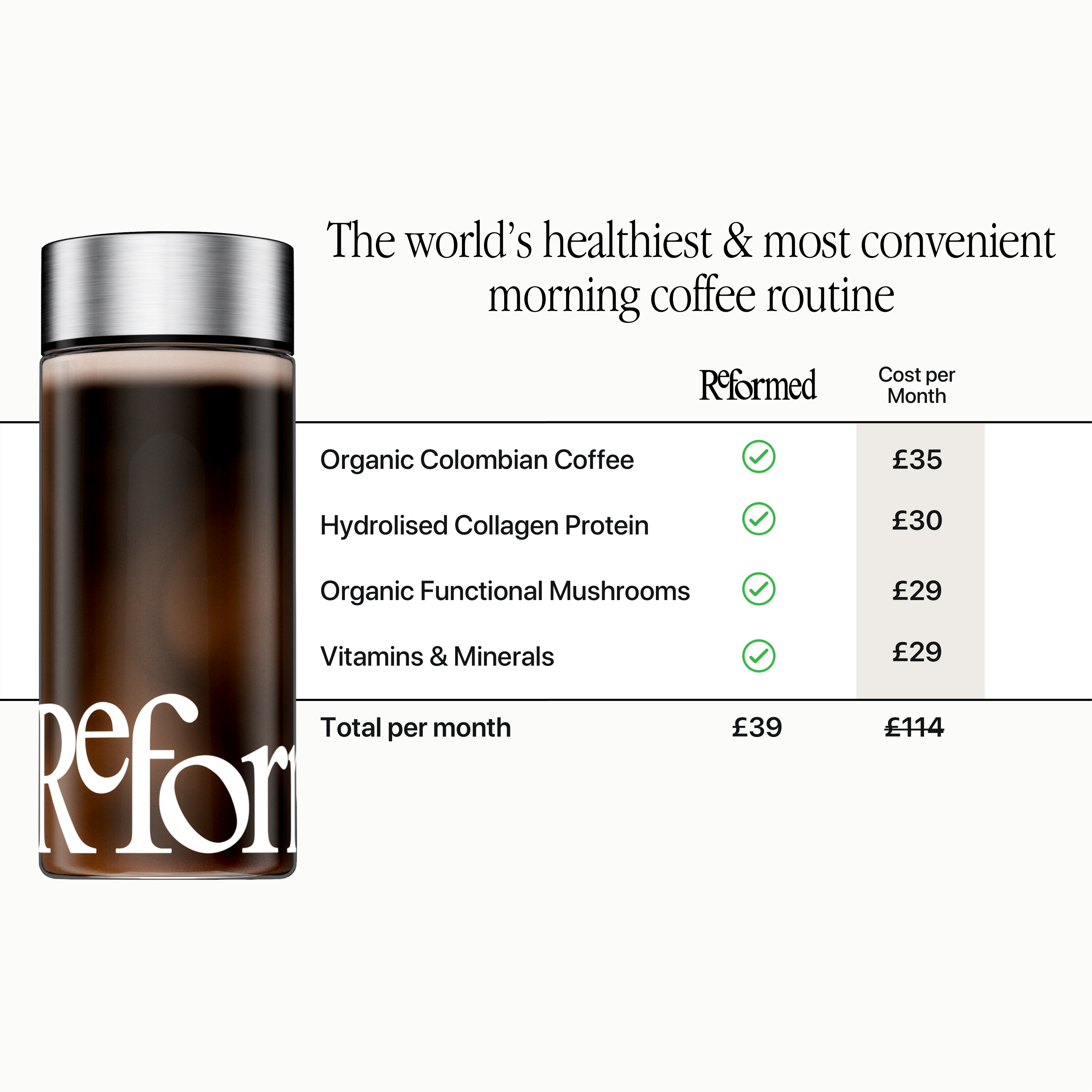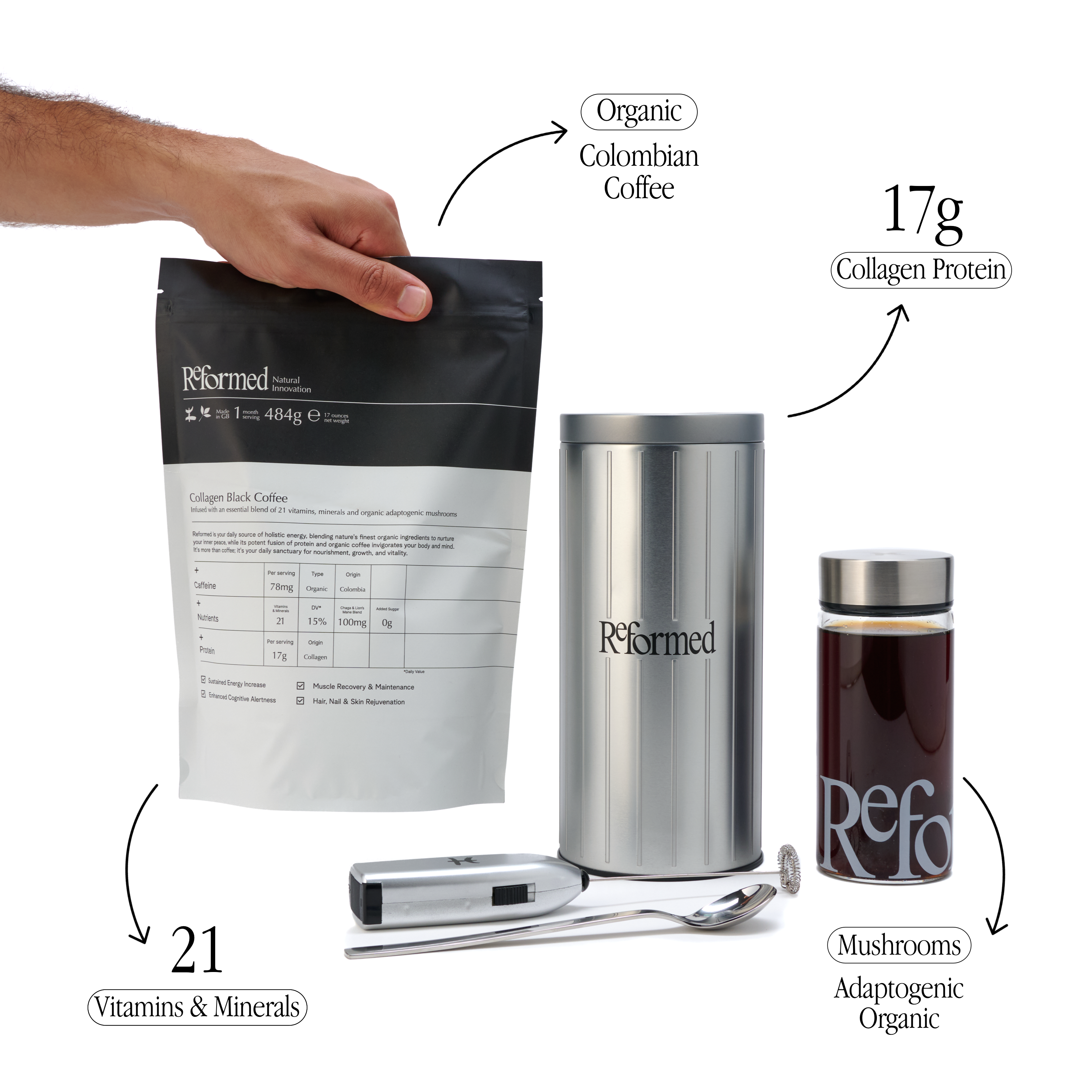 Reformed coffee provides a host of health benefits, sourced from each carefully selected ingredient. Enjoy lean muscle support, skin and joint health, revitalised hair and nails and boosted immunity and sharpen focus.