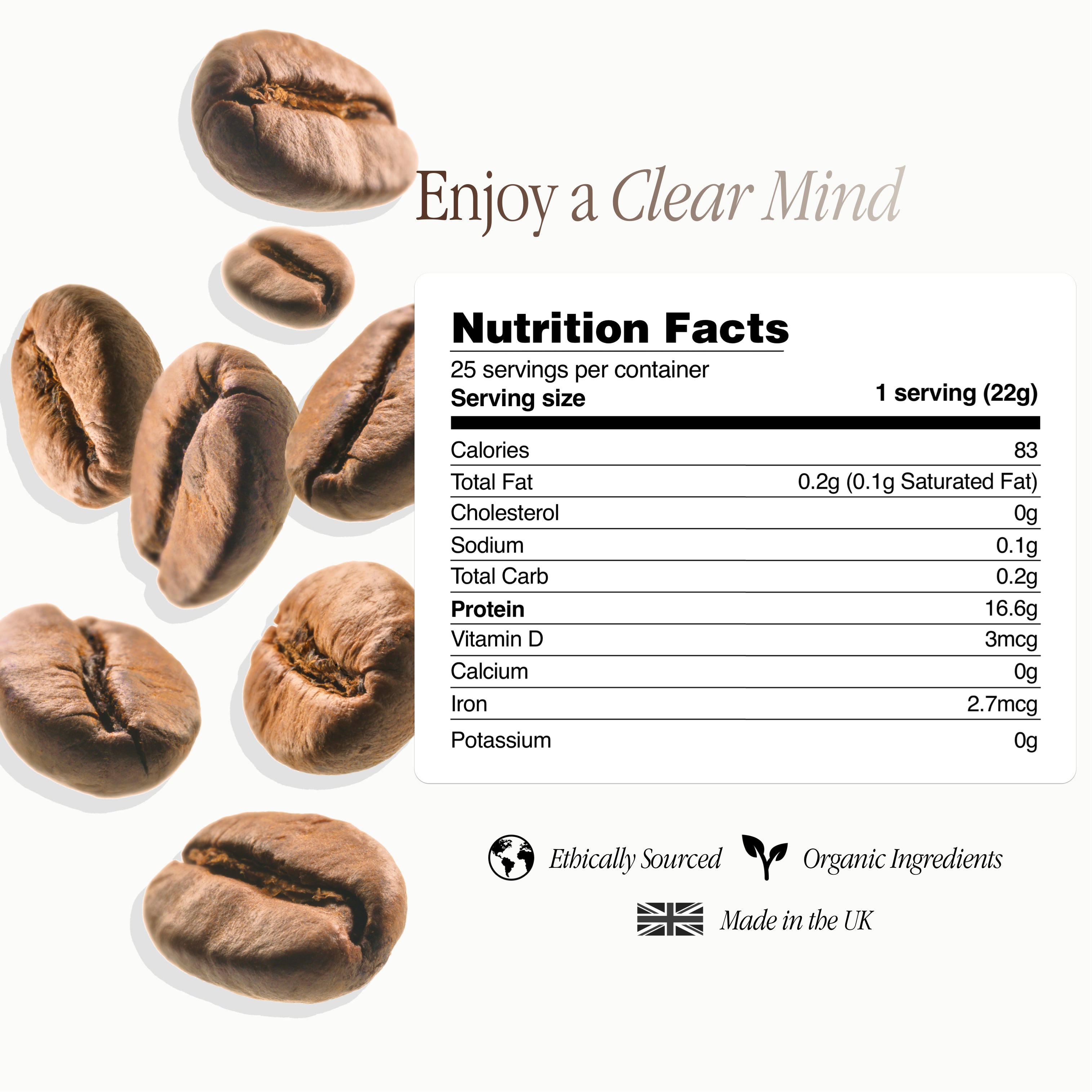 Hydrolysed Collagen (Grass-fed), Organic Freeze-Dried Colombian Coffee, Organic MCT Powder, Organic Lion’s Mane, Organic Chaga, Organic Madagascan Vanilla Powder, blend of Vitamins & Minerals.