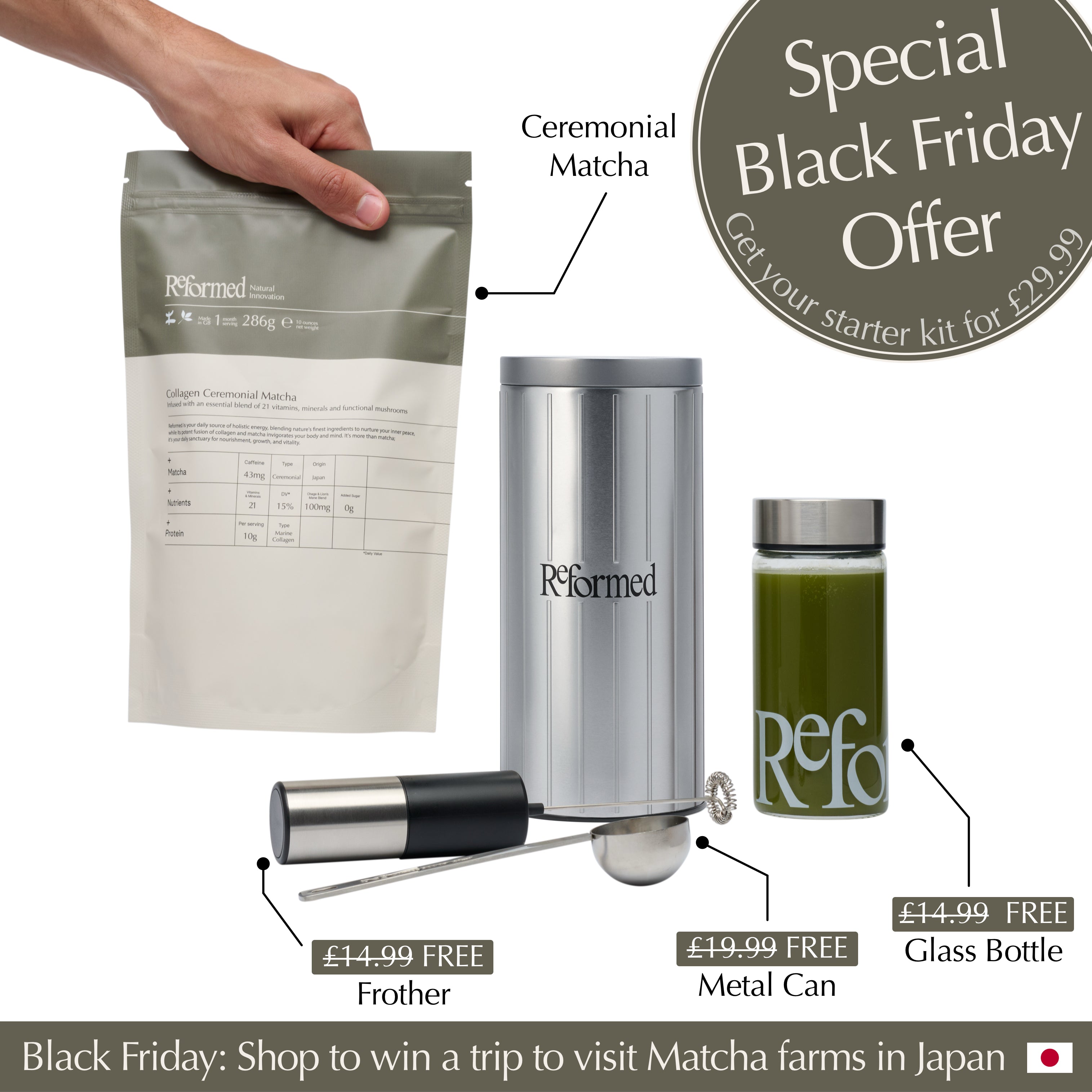 As part of our unique Black Friday Offer, we will be hosting an extraordinary giveaway for anyone who decides to purchase our black friday offer as well as our active subscribers - the winners of the giveaway will be offered a all inclusive trip to Japan to visit the farms where the Matcha used in Reformed is cultivated, as well as all the relevant manufacturing facilities