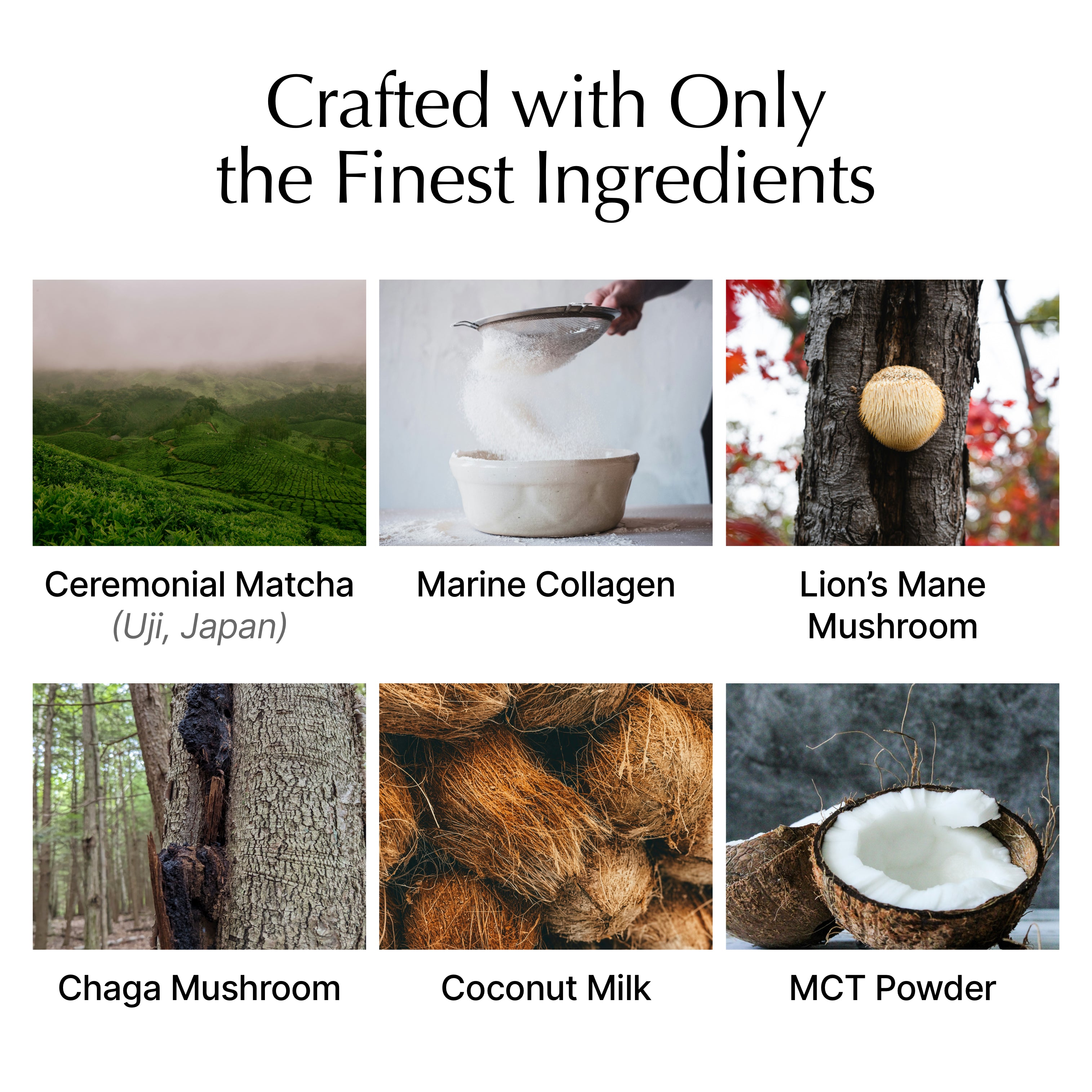 Ceremonial Matcha Tea Powder, Hydrolysed Collagen (Marine), MCT Powder, Coconut Milk Powder, Lion's Mane Mushroom, Chaga Mushroom, Maitake Mushroom, Shiitake Mushroom, Vitamins & Minerals